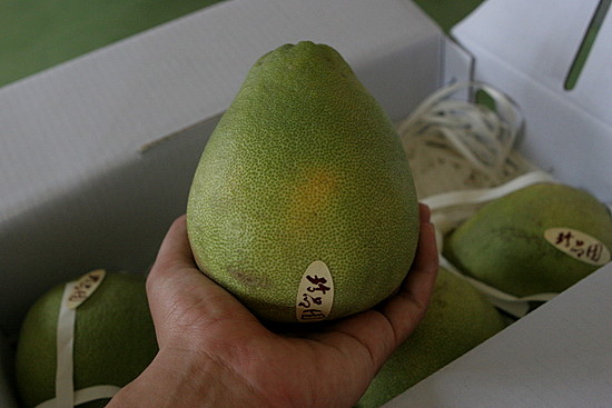 看文旦柚的形狀可以大概評定這顆文旦好不好吃,這顆文旦是屬於特級的哦。上面黃色的塊狀區是果蠅釘過的痕跡,下面土色的部份也是,只要不是很多的話,一般來說對品質影響不大。
